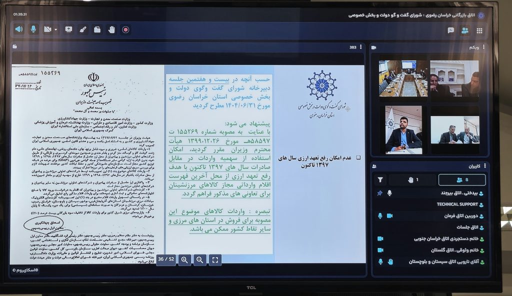 در نشست مشترک دبیرخانههای شوراهای گفتوگوی استانهای شرق و شمال شرق کشور که بصورت آنلاین برگزار گردید بسته موانع و چالش های شرکت های تعاونی مرزنشینان و پیشنهادات دبیرخانه های شورای های گفت و گو مورد بحث و بررسی قرار گرفت.
