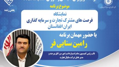 برنامه تلویزیونی شب های زعفرونی امشب ساعت ۲۱ موضوع برنامه: نمایشگاه فرصتهای مشترک تجارت و سرمایهگذاری ایران و افغانستان مهمان…